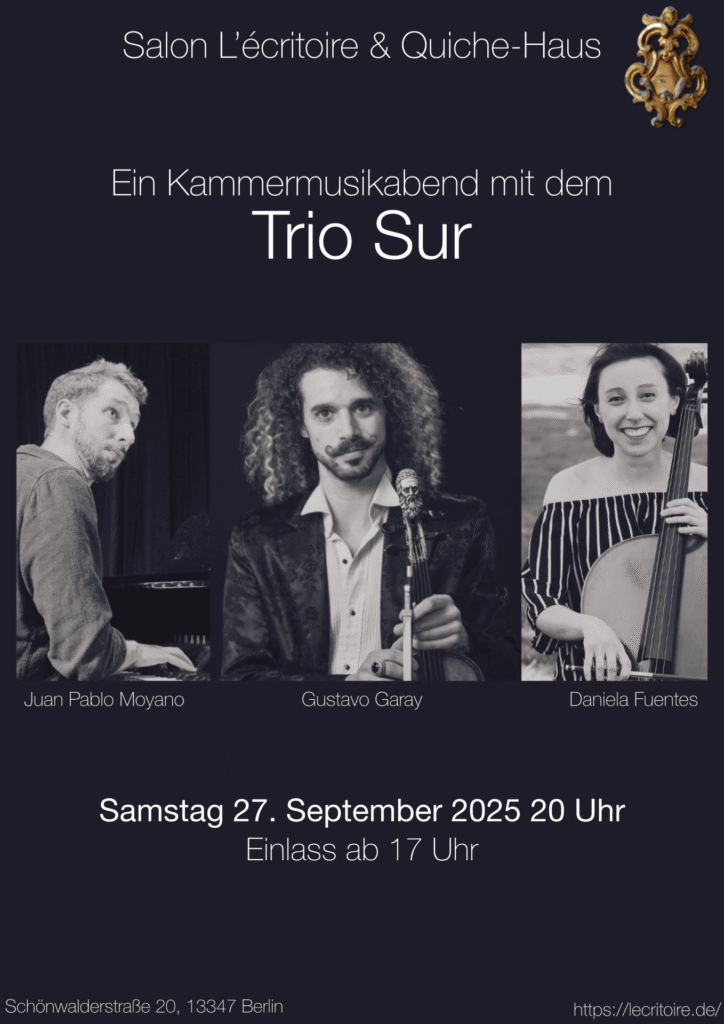 The Trio Sur, consisting of Gustavo Garay (violin), Daniela Fuentes (cello) and Juan Pablo Moyano (piano), is based in Berlin. They are working on preparing their repertoire for 2024 and on performances at various cultural institutions in the city.
